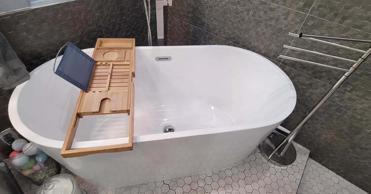 We installed a beautiful floating bathtub, complete with a stylish bathtub tray for convenience. This feature adds sophistication while maximizing floor space.