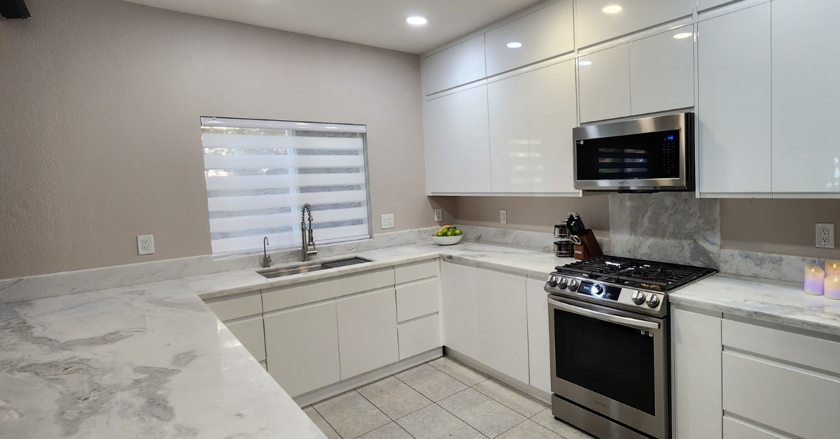 New white kitchen cabinets provide ample storage while maintaining a clean, sleek look. We chose stunning white marble countertops that offer elegance and durability to this kitchen remodel project.