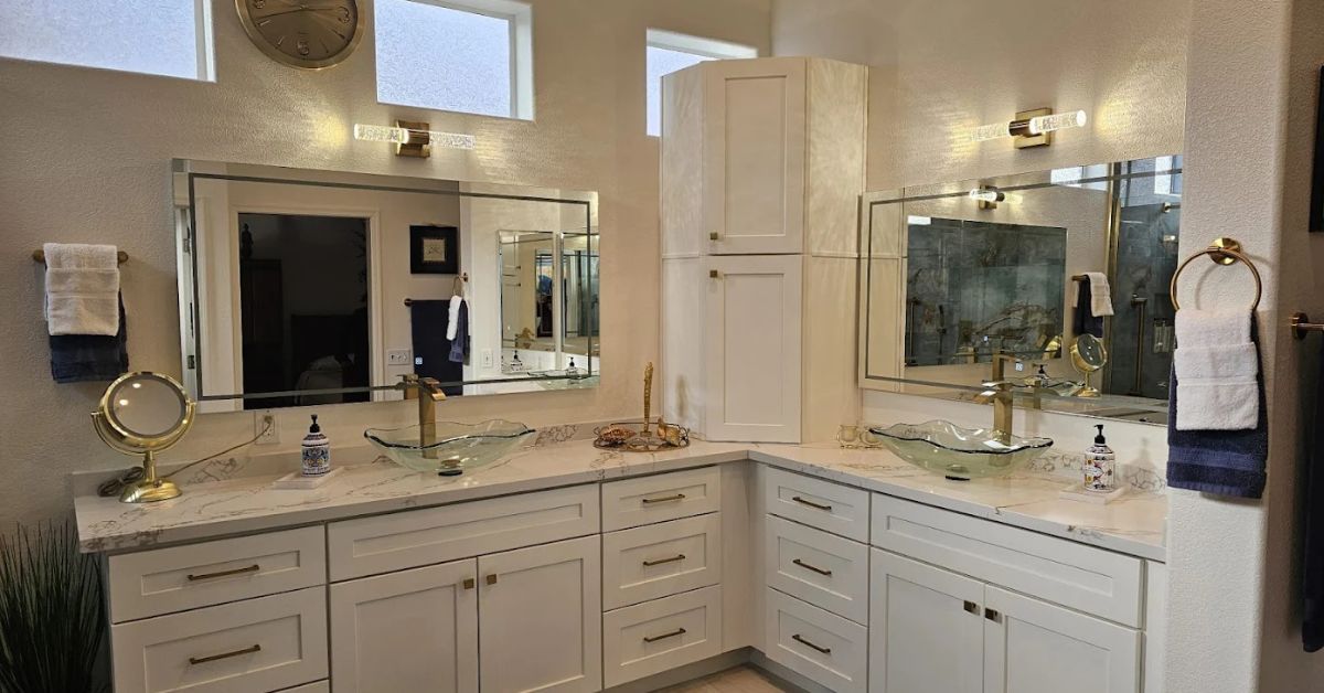 New white cabinets provide ample storage while keeping the space feeling open. Two stylish vanity mirrors were installed, complemented by elegant lighting for a polished look.