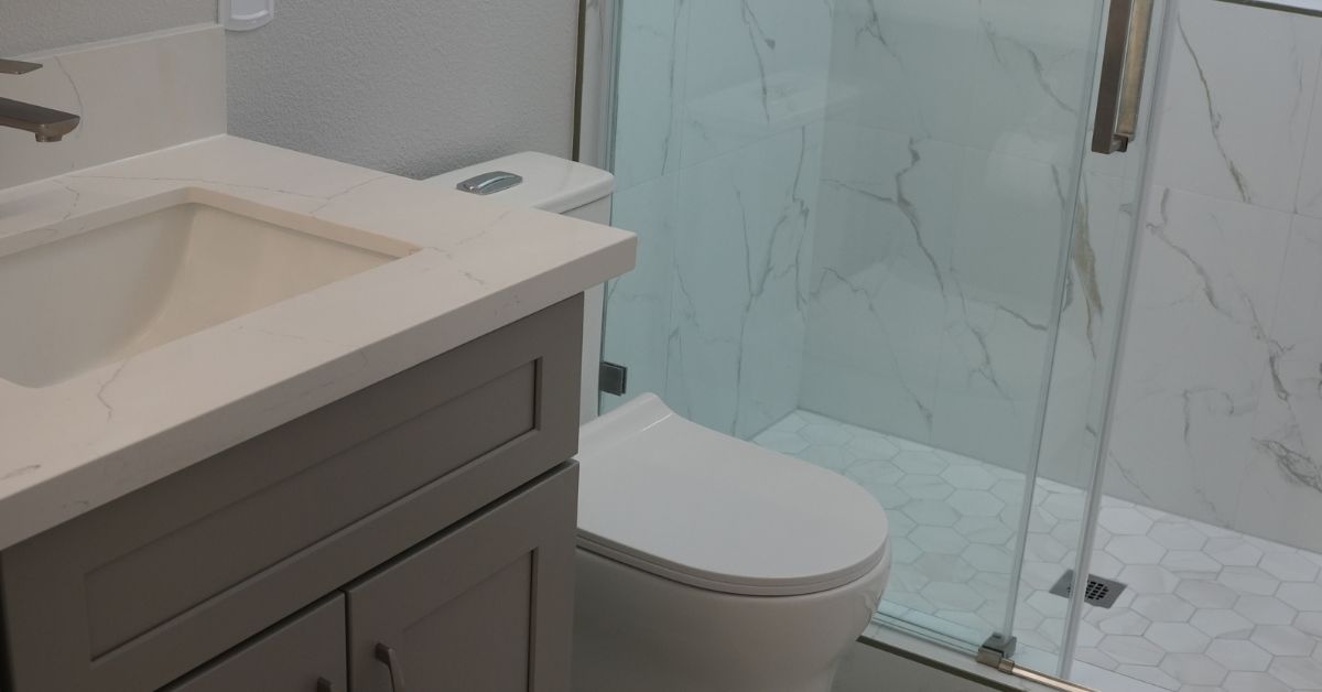 The finished bathroom remodel in Spring Valley is a perfect blend of modern simplicity and comfort. The white marble walls paired with gray accents make the space feel both bright and luxurious, while the updated fixtures and layout improve everyday convenience.